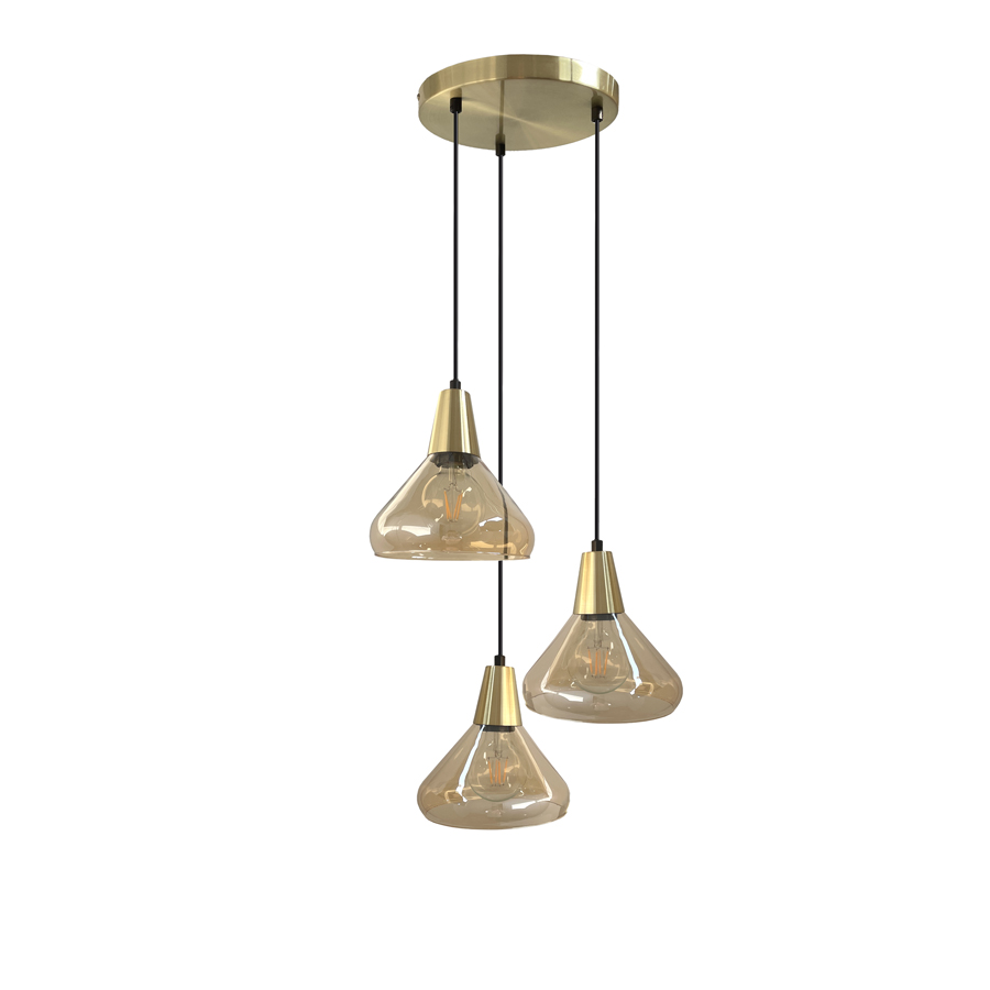 Lustre 3 lampes andrew en métal laiton brossé et verre ambre clair